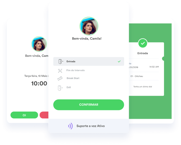 Ative a opção ‘touchless’ para bater ponto por comando de voz! Basta o colaborador dizer os comandos corretos para registrar o ponto sem precisar tocar no tablet.