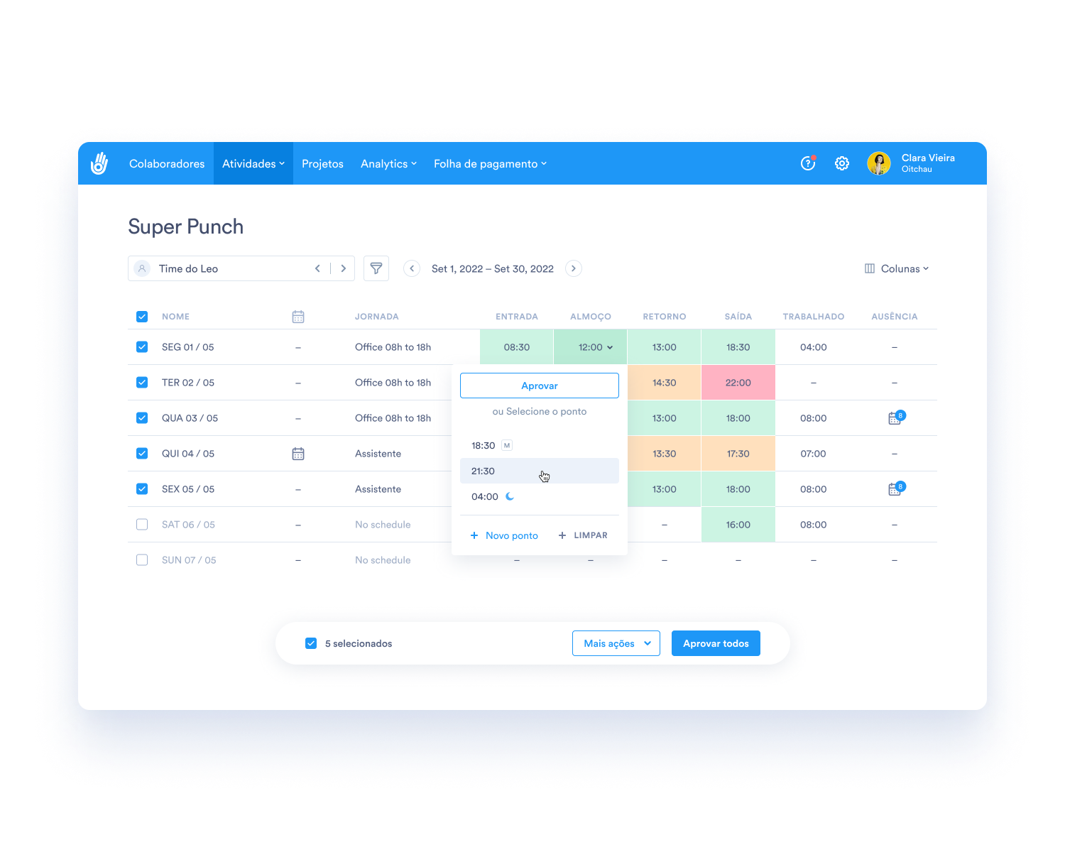 Com essa integração, o Oitchau recebe todas as informações sobre os horários registrados dos funcionários cadastrados, permitindo que você visualize e gerencie facilmente os registros de ponto de todos os funcionários e aprove ou rejeite as marcações de ponto e solicitações de ausência com poucos cliques.